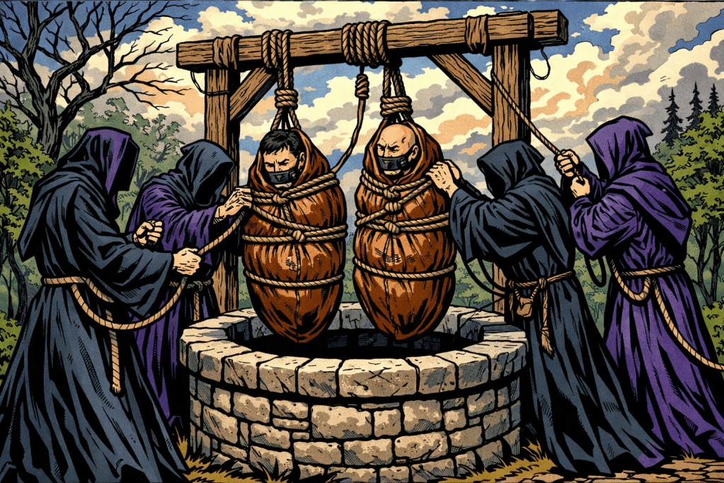 La multitud comenzó un cántico monocorde: “Larga vida al señor de las profundidades”. Silas y Balthazar fueron introducidos en sacos de cuero fétido, cosidos con tendones, que ya presentaban orificios quirúrgicamente dispuestos para que la vida escurriera hacia el pozo. Los bultos fueron izados en una viga de madera podrida que crujía bajo el peso de la carne joven.